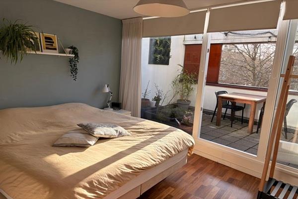 Boven biedt de ruime slaapkamer een rustige en privé-toevluchtsoord. Deze is voorzien van een grote kledingkast en directe toegang tot een heerlijk terras – compleet met planten en sfeervolle verlichting – waardoor een rustige buitenruimte ontstaat om te ontspannen.