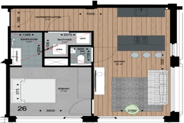 Entree, vaste kastruimte met witgoedaansluiting, toilet met fonteintje, luxe open keuken voorzien van een 4-pits inductiekookplaat, afzuigschouw, koelkast, vaatwasser en combimagnetron, woonkamer, ruime slaapkamer en een nette badkamer met badmeubel en inloopdouche.