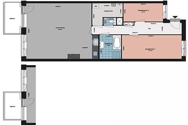 Entree, lange hal met toegang tot de twee slaapkamers (circa 15 m2 en 9 m2), badkamer met ligbad, douche, dubbele wastafel en separaat toilet, berging met wasmachine/drogeraansluiting, ruime woonkamer (circa 40 m2) met een luxe witte hoekkeuken voorzien van alle inbouwapparatuur. Vanuit de woonkamer heb je toegang tot je balkon!