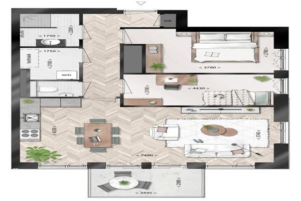 Het appartement heeft 2 slaapkamers en een eigen privé buitenruimte met een oppervlakte van 7m2.
