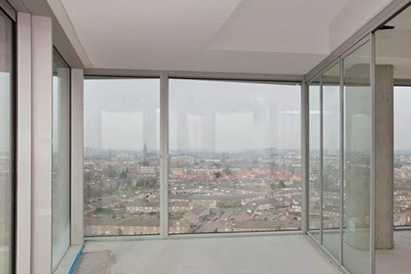 De licht overgoten woonkamer wordt gedomineerd door de grote raampartijen tot aan de grond. De woonkamer is ruim van opzet en praktisch in te delen. Een grote schuifpui geeft toegang tot het balkon.