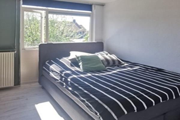 Ook de slaapkamer bevindt zich aan de rustige achterzijde van het appartement en beschikt over een handige inbouwkast, wat zorgt voor extra opbergruimte.