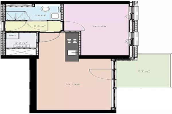 De slaapkamer van circa 14 m² is ruim opgezet en biedt voldoende plaats voor een comfortabel bed en kastruimte. De badkamer (ca. 3,6 m²) is praktisch ingericht en wordt aangevuld met een separaat toilet, wat zorgt voor extra gemak. Daarnaast beschikt de woning over een interne berging met aansluitingen voor wasapparatuur.