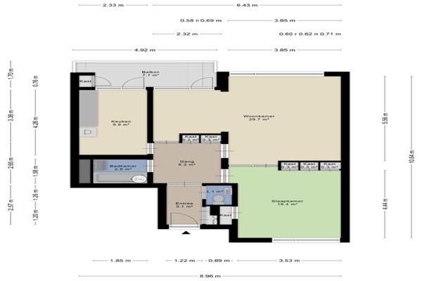 De woning is gelegen op de vierde etage en is bereikbaar met een lift en gelegen aan een galerij aan de zuidkant, waar de keuken en een slaapkamer zijn gesitueerd. De badkamer is uitgerust met een douche en wastafel, hier bevindt zich ook de wasmachineaansluiting.