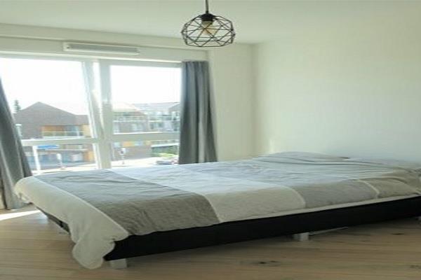 De riante slaapkamer, met eveneens een raam vanaf de grond tot het plafond meet ca. 12m2. De geheel betegelde badkamer heeft een douche, wastafelmeubel en aansluiting voor de wasmachine.