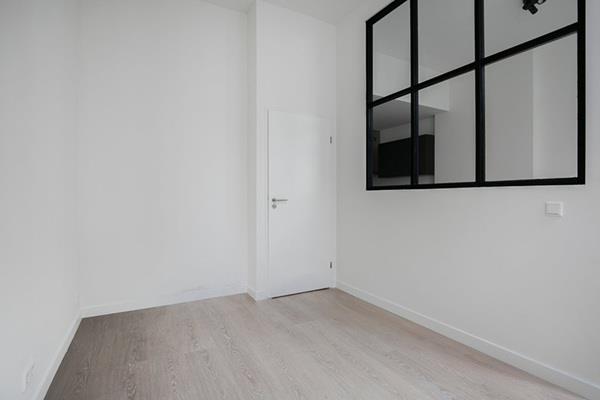 Vanuit de woonkamer is de slaapkamer bereikbaar. Het industriële loft gevoel wordt hier nog versterkt door het zwarte binnenkozijn dat de beide ruimtes met elkaar verbindt. De aansluitende moderne badkamer is voorzien van een inloopdouche met thermostaatkraan, eigentijds zwart garnituur, wastafelmeubel en designradiator.