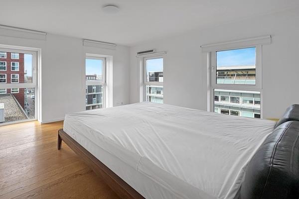 Vanuit de woonkamer heeft u toegang tot het terras, waar u kunt genieten van een prachtig uitzicht over Amsterdam.