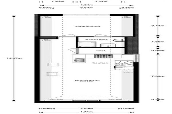Entree, verzorgd gemeenschappelijk trappenhuis met de woningtoegangsdeur op de tweede verdieping, trap naar de derde verdieping. Ruime woonkamer met open keuken welke is voorzien van diverse inbouwapparatuur zoals een koelkast met vriesvak, 4-pits gaskookplaat, afzuigkap, combi oven/magnetron en vaatwasser. Hal met toegang tot de slaapkamer, het separate toilet met fontein en de ruime inbouwkast met de CV ketel, de wasmachine en droger. De slaapkamer is gelegen aan de achterzijde en beschikt over een en-suite badkamer met inloopdouche en een wastafel.