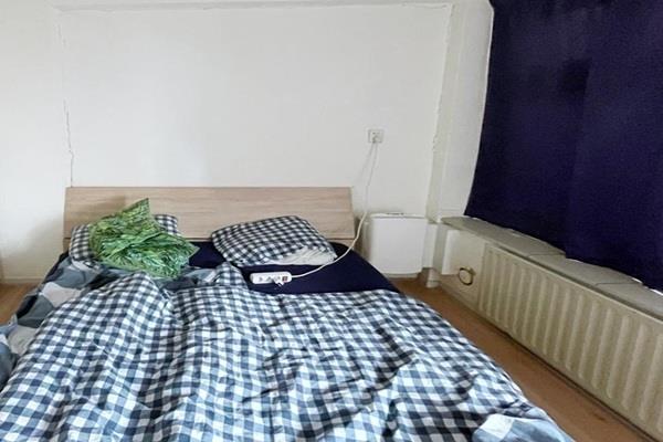 grond, trap naar 1e etage, entree appartement, hal, woonkamer met open keuken met elektrische kookplaat en afzuigkap. Vanuit de hal toegang tot slaapkamer en badkamer voorzien van douche, toilet, wastafel en wasmachineaansluiting. De woning is voorzien van een laminaat vloer en er is gedeeld gebruik van een dakterras.