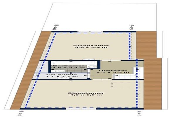 Naast de twee slaapkamers vinden we op deze etage ook de tweede badkamer met ligbad, tweede toilet en wastafel en de CV-ruimte.