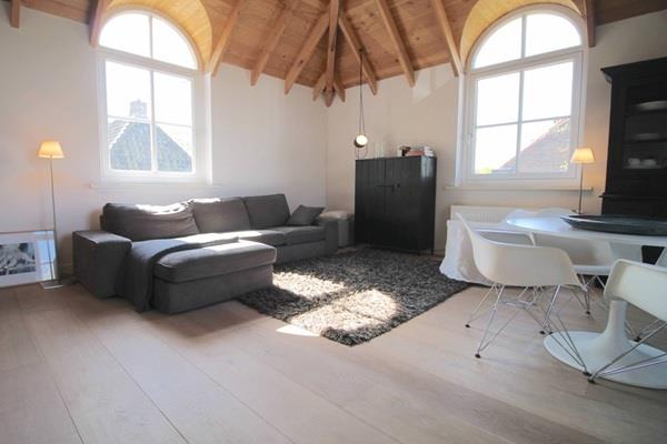 Lichte woonkamer met open keuken die is uitgerust met moderne inbouwapparatuur en veel bergruimte. De woning is volledig gemeubileerd.