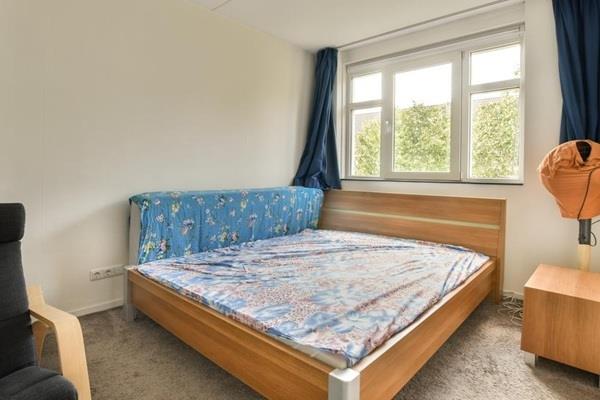 De bovenste verdieping doet dienst als slaapkamer en is royaal bemeten met een hoog plafond en veel natuurlijke lichtinval. Op de overloop bevinden zich aansluitingen voor een wasmachine en droger, beide aanwezig in de woning.