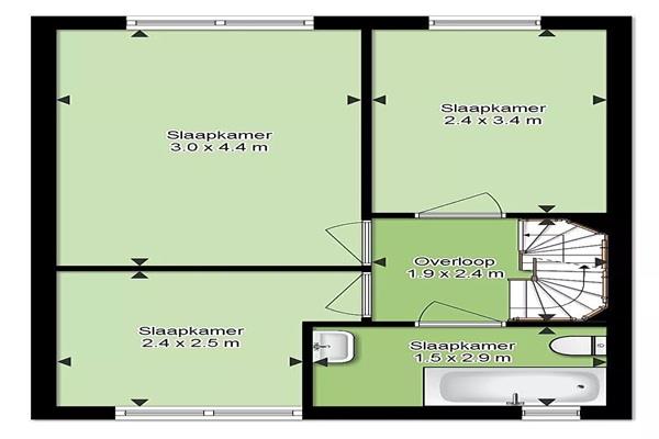 Op de eerste verdieping bevinden zich drie slaapkamers, waardoor de woning zeer geschikt is voor gezinnen, thuiswerkers of mensen die extra ruimte wensen. De hoofdslaapkamer is ruim opgezet en de overige kamers zijn eveneens goed te gebruiken als slaap-, werk- of hobbyruimte. De badkamer is netjes en voorzien van een douche, wastafel en toilet. De overloop zorgt voor een logische en comfortabele verbinding tussen alle ruimtes.