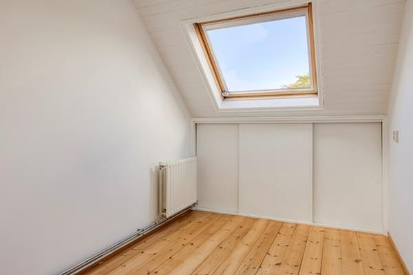 Ruime slaapkamer over de volledige diepte van de woning met dakraam aan de achterzijde. Slaapkamer aan de achterzijde ook met dakraam. Op deze verdieping bevindt zich veel bergruimte onder de schuine kap.