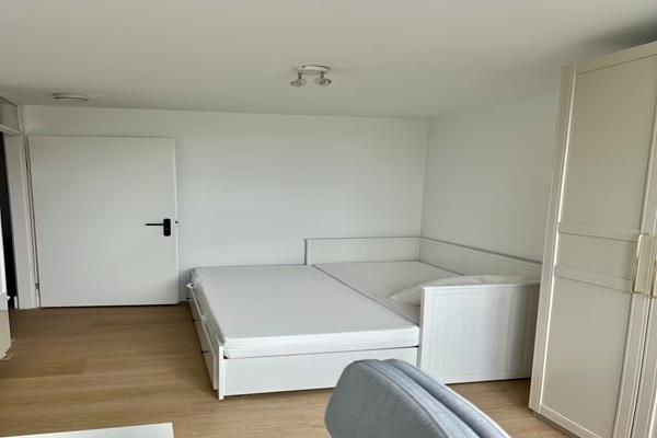 De kamer (15 m2) is doordacht ontworpen en volledig uitgerust voor comfortabel wonen, met een uitklapbaar tweepersoonsbed, grote nieuwe kledingkasten, een aparte werkplek en zowel privacy- als verduisteringsgordijnen.
