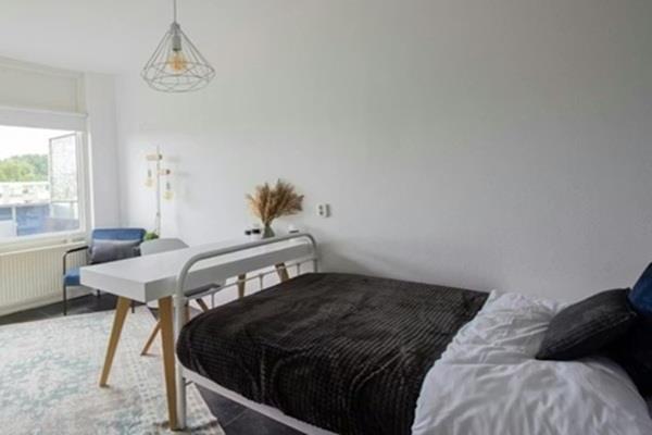 De kamer is modern ingericht met een bed, kledingkast, bureau en fauteuil.
