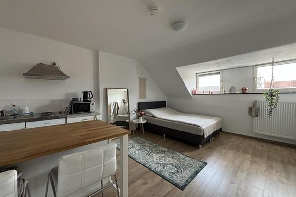 Via de entree bereikt u de hal en de lichte woon-/slaapruimte van circa 20 m² met open keuken, uitgerust met een afzuigkap, 2-pits kookplaat en koelkast. De badkamer (5 m²) is praktisch ingedeeld en voorzien van een douche, wastafel en toilet.